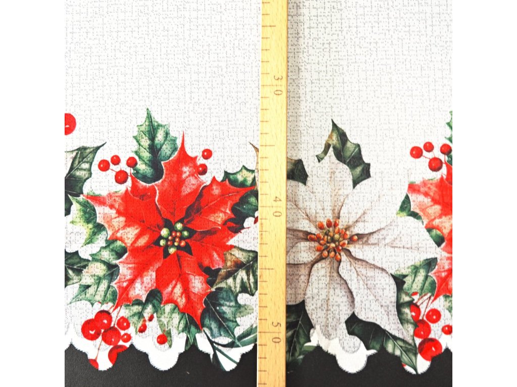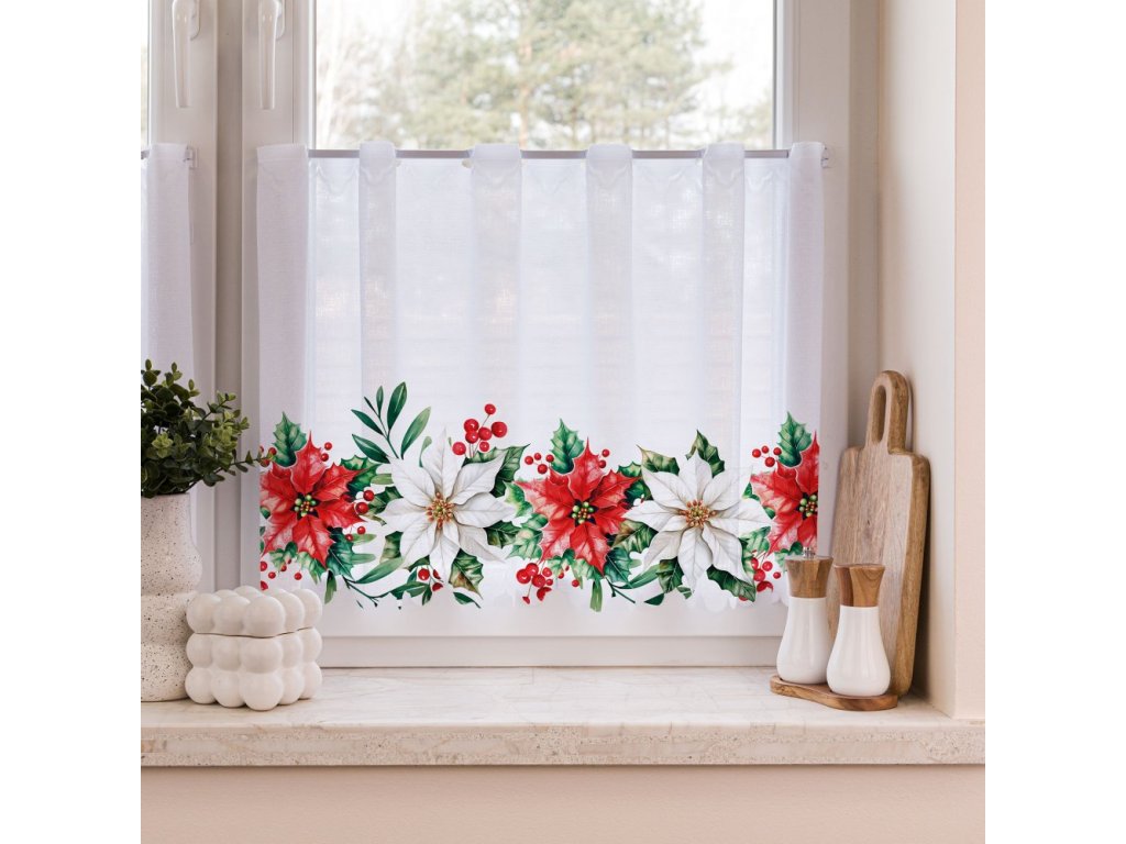 Vánoční záclona je ušita z hustšího bílého žakárového materiálu a zdobí ji elegantní motiv vánočních růží. Je vybavena vitrážovými očky o velikosti 3×1 cm, díky nimž ji snadno zavěsíte bez nutnosti dalších úprav – stačí pouze obšít boky.