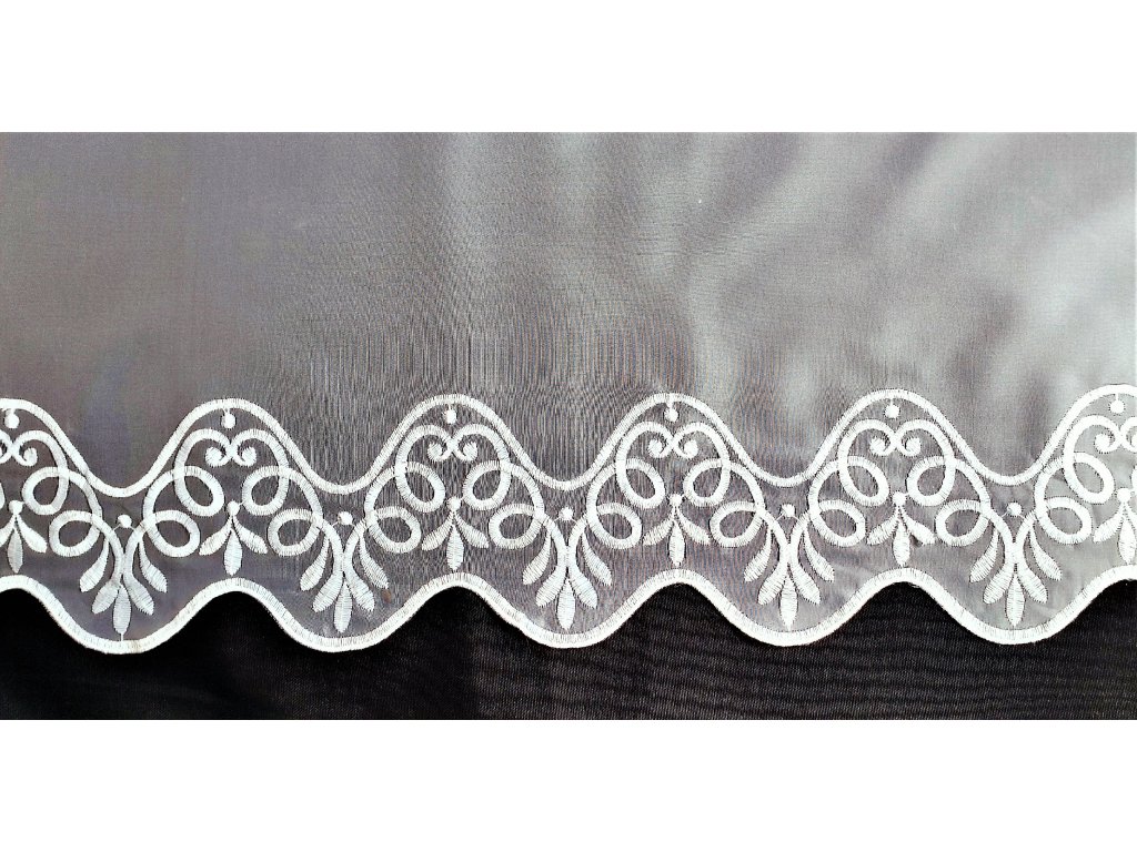 Voálová vitrážka s vyšívanou ozdobnou dordurou, která se vyrábí ve výšce 60 cm.