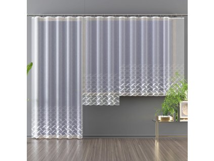 Celoplošný vzor této záclony zaujme nevšedním designem různě uspořádaných bílých ostrůvků. Záclona je ve spodní části téměř rovná, ukončená 3 mm širokým proužkem.